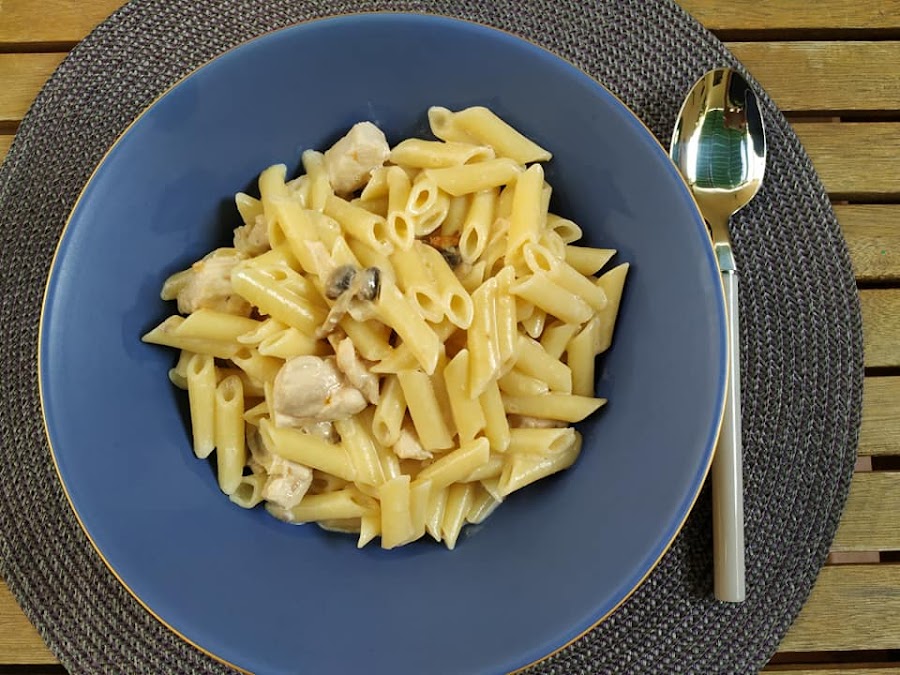 Mientras cocemos la pasta vamos preparando la salsa, cortamos la cebolla en juliana, lavamos bien los champiñones y los troceamos, cortamos la pechulla de pollo en trozos pequeños, ponemos una cacerola con un buen chorro de aceite de oliva en el fuego, primero sofreímos la cebolla después añadimos el pollo, rallamos el tomate y lo agregamos, removemos bien y por último incorporamos los champiñones, una vez esté todo hecho le ponemos sal y la pimienta al gusto, vertemos la nata (crema de leche) vegetal y movemos bien.