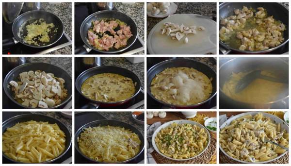 Ya tenemos el pollo y los champiñones, vertemos la leche evaporada o la nata (crema de leche) y dejamos que el conjunto hierva. Añadimos la pasta ya cocida y escurrida. Mezclamos el conjunto.