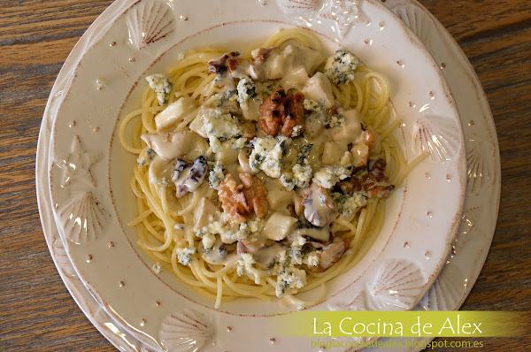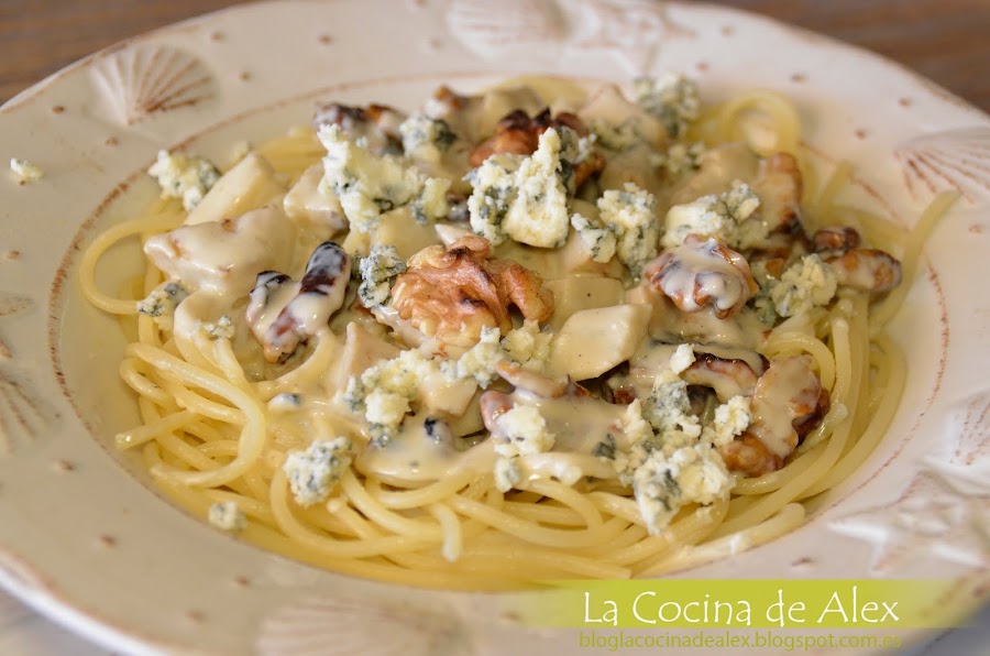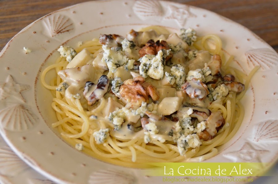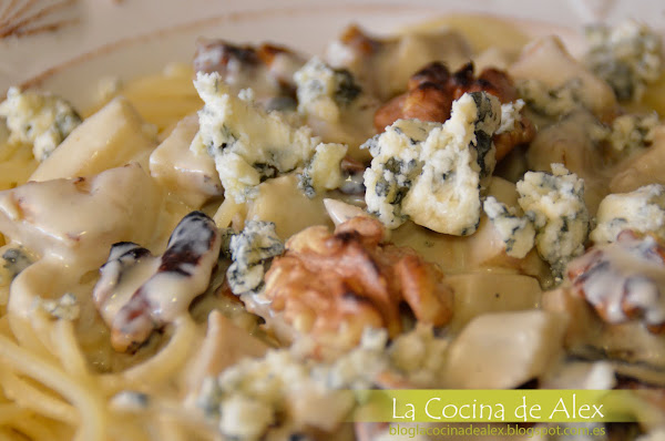 Ya solo queda hacer la presentación final del plato, ponemos en la base la pasta recién cocida y salseamos por encima con nuestra salsa de queso, manzanas y nueces. Para adornar el plato podemos poner unas nueces y unos tacos de queso por encima.