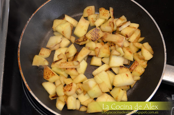Pelamos, troceamos la manzana y la salteamos en una sarten con un poco de aceite durante unos minutos. Reservamos.