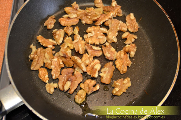 En la misma sarten donde hemos hecho la manzana, tostamos un poco las nueces troceadas. Reservamos.
