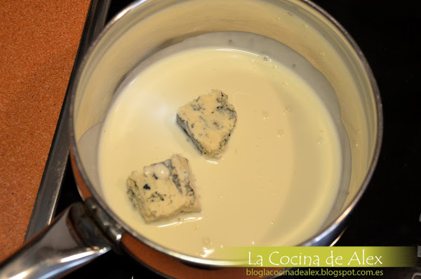 Mientras se cuece la pasta, vamos a hacer la salsa, en un cazo ponemos la nata (crema de leche) junto con el queso, dejando un poco para la presentación final. Ponemos a fuego medio hasta que el queso este desecho. Rectificamos de sal y pimienta.