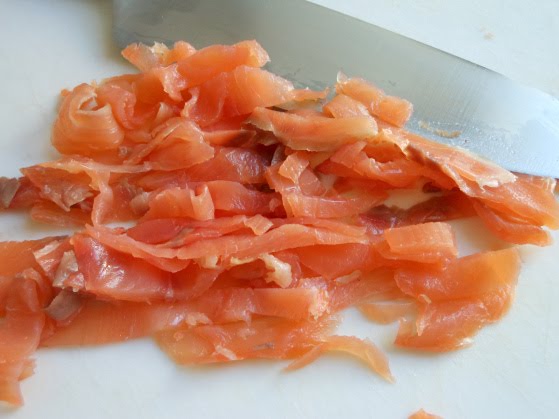 Tras esto, corta las lonchas de salmón ahumado en tiras y reserva.