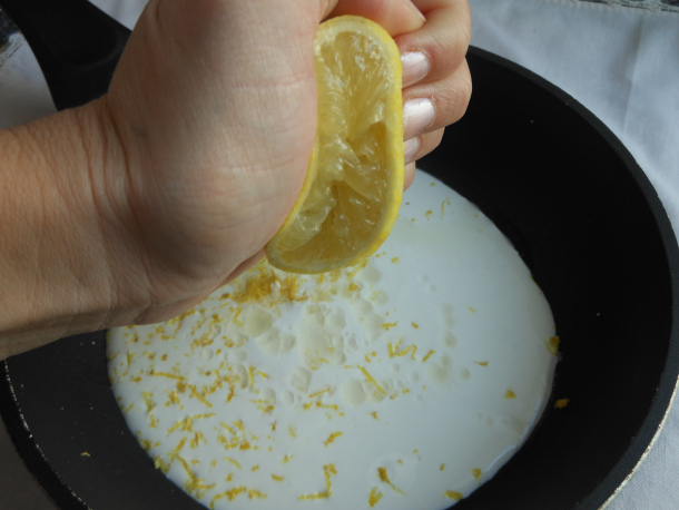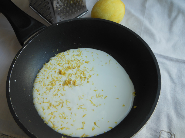 Después ralla la piel del limón y mézclala con la crema de leche o la nata (crema de leche) en una sartén.