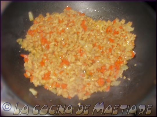 En un Wok ponemos a calentar un poco de aceite de oliva virgen y pochamos la cebolla cortada en brunoise que sazonaremos con un poco de sal. Cuando hayan pasado 2-3 minutos añadimos el ajo picado. Cocinamos 1 minuto más y antes de que el ajo se dore añadir la zanahoria que habremos picado fina ( o brunoise muy pequeña) para que se cocine más rápido.