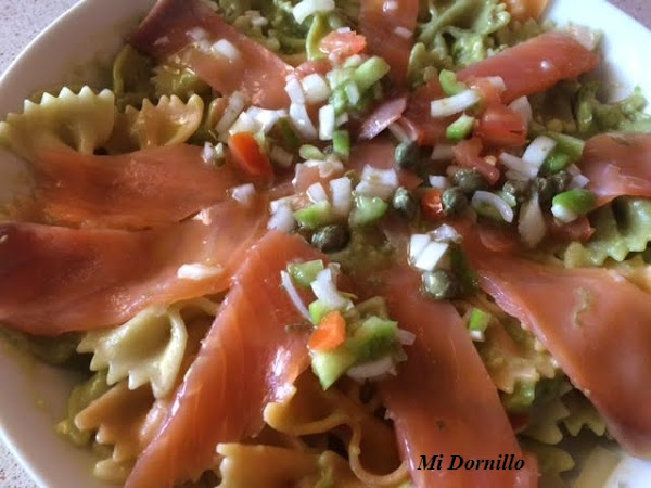 Mezclamos la salsa con la pasta, en el momento de servir adornamos con taquitos o lonchas de salmón, le ponemos la vinagreta por encima y a comer.
