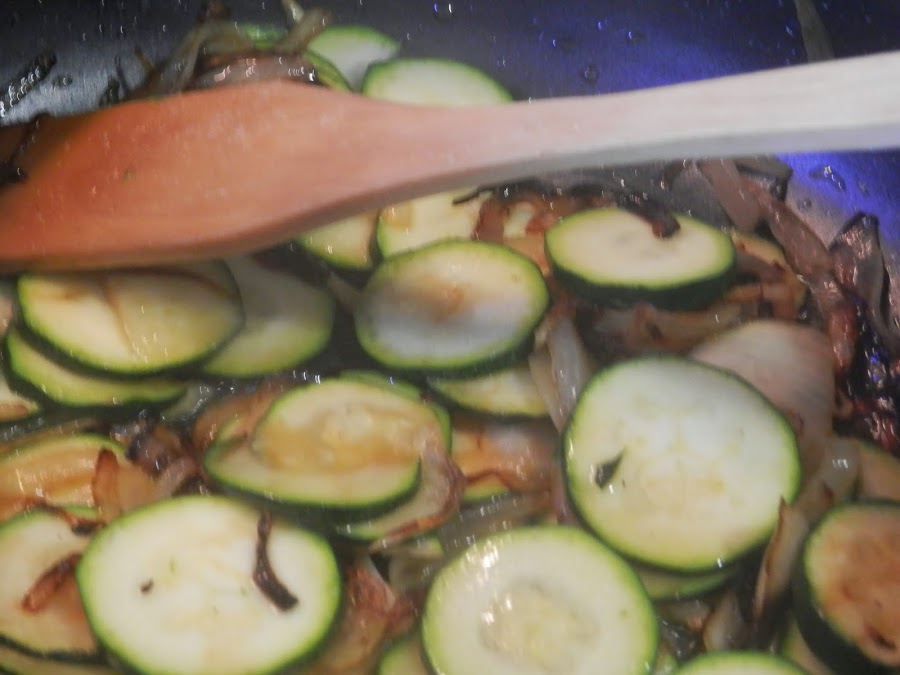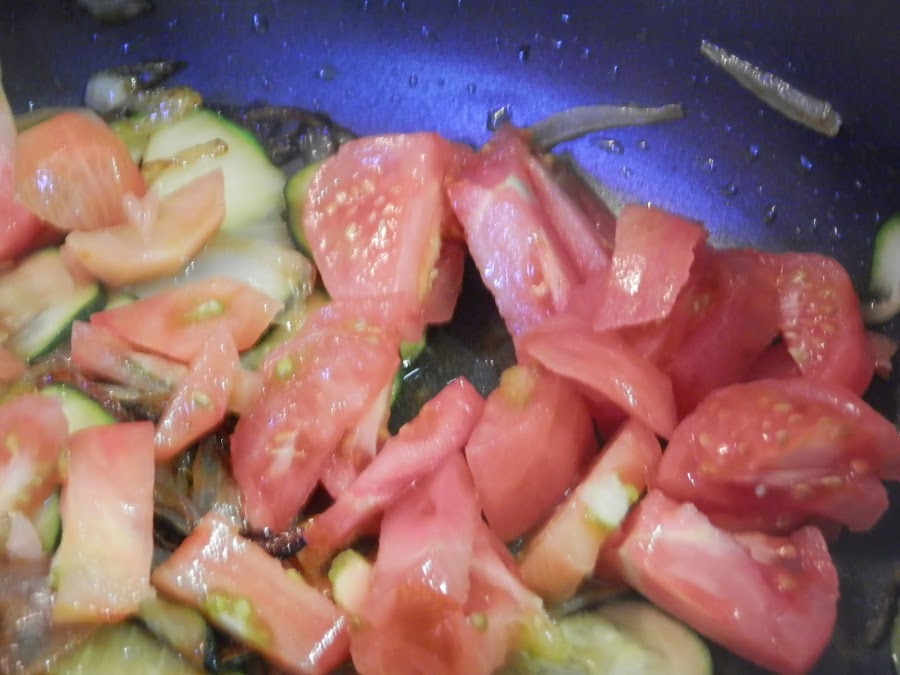 A continuación añadiremos el calabacín y cuando ya esté casi hecho pondremos el tomate a dados.