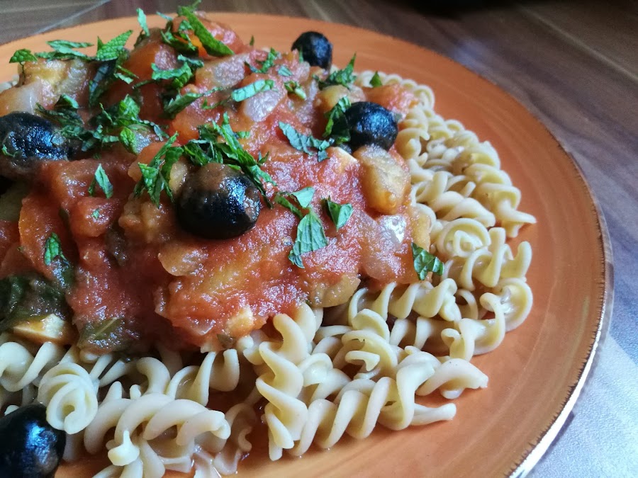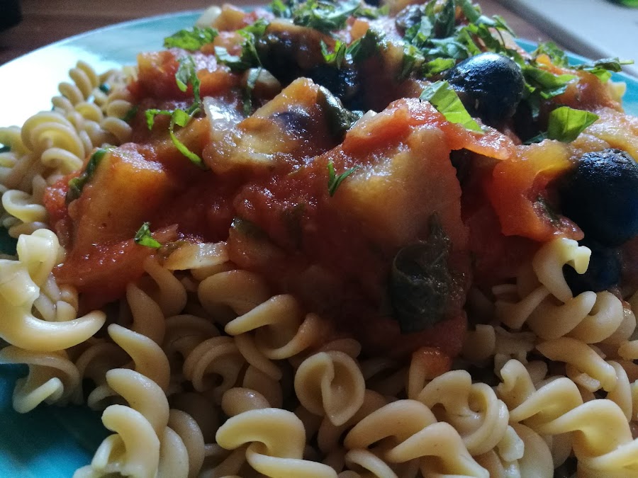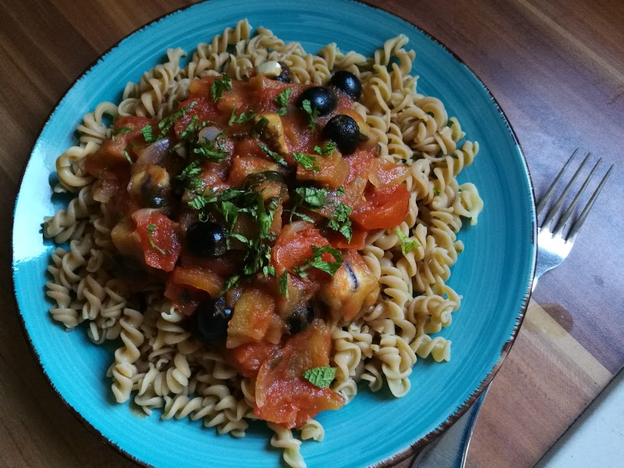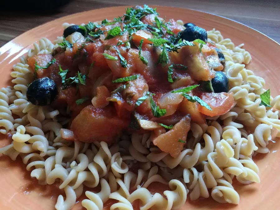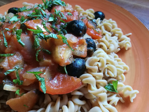 - Cuando haya pasado el tiempo de la salsa, añadimos las aceitunas, el resto de albahaca picada, removemos y servimos encima de la pasta.