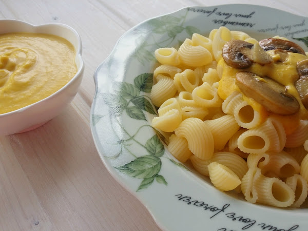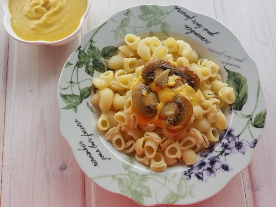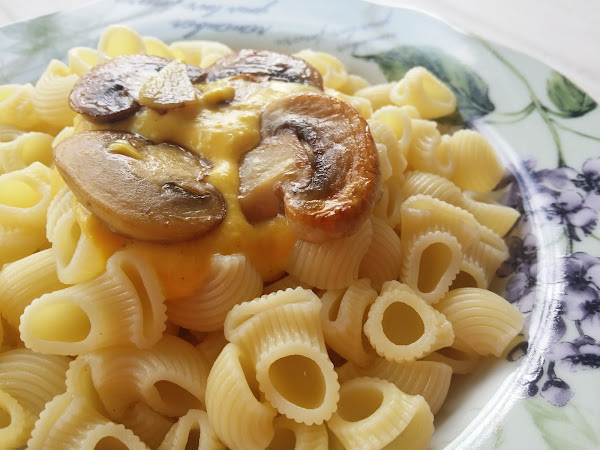 5. Servimos con la pasta cocida, y con los champiñones, que habremos salteado en una sartén junto con una cucharada de aceite y el otro diente de ajo en láminas.