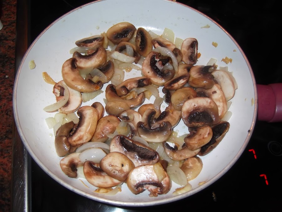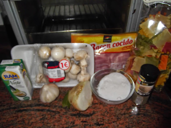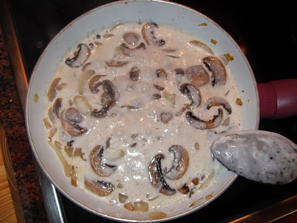 En una sartén echa un poco de aceite y añade el ajo cortado en trozos pequeños, a continuación añade la cebolla también cortada en cachos y deja que se doré mientras limpias las champiñones de la tierra que puedan tener. Cuando la cebolla comience a dorarse añadís los champiñones laminados a la sartén y cuando veáis que están cocinados le añadís la nata (crema de leche), la pimienta y la sal, le dais un par de vueltas y lo sacáis para triturarlo.