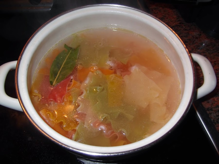 Cueza la pasta en una olla con abundante agua hirviendo, sal, un chorro de aceite y una hoja de laurel. En este caso he utilizado pasta de colores por lo que tarda menos tiempo que la pasta normal, así que con dejarla cinco minutos ya estaba lista. Luego la puse en un escurridor y le eche un poco de agua fría, eso sí si utilizáis este tipo de pasta tened cuidado ya que es más blanda que las otras.