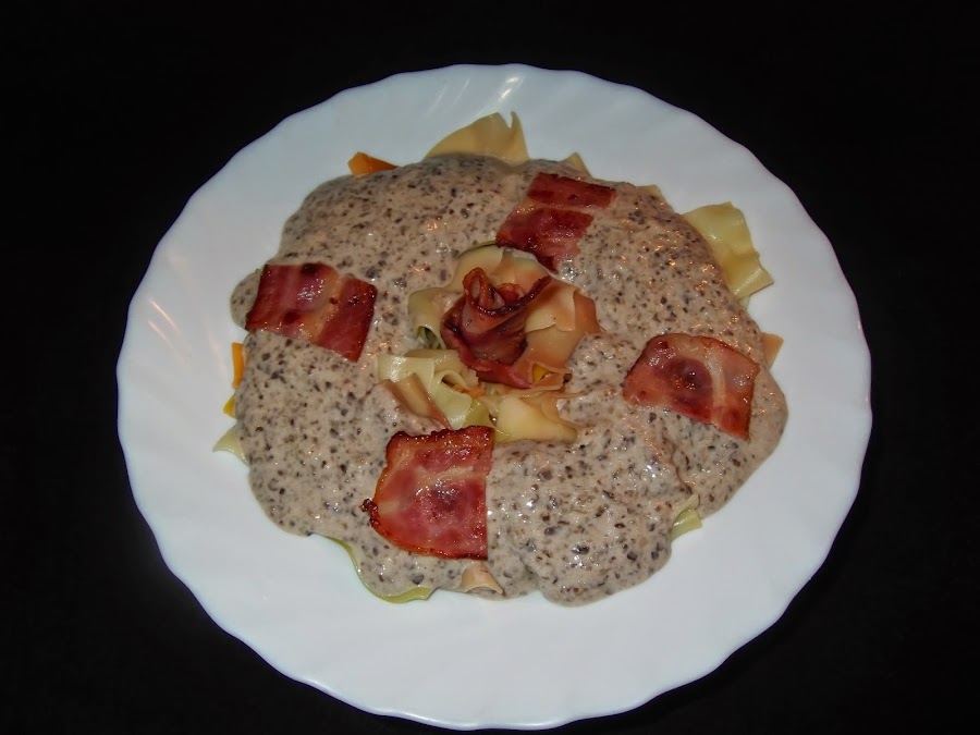 En otra sartén con un poco de aceite doráis el bacon que luego nos servirá para decorar el plato. Ahora sólo queda montarlo. Echáis en cada uno de los platos la pasta que ya tenéis preparada, encima la salsa que más os guste y que todavía estará caliente y colocáis el bacon decorando el plato y ya está listo para comer.