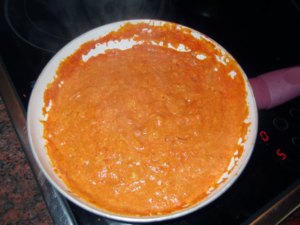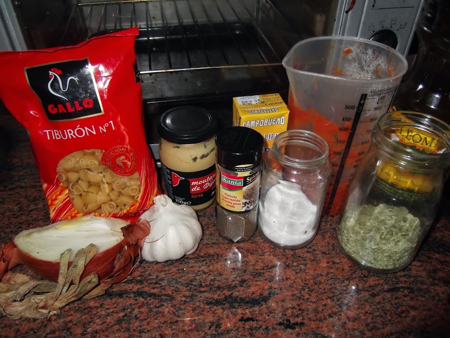 Mientras tanto vamos elaborando nuestra salsa, para ello ponemos en una sartén la cebolla y ajo picado de manera fina y vamos friendo a fuego lento. Cuando lo tengamos todo pochado añadimos el tomate frito, la nata (crema de leche), la mostaza, el orégano, la sal y la pimienta molida y lo dejamos reducir a fuego lento durante cinco minutos o hasta que la salsa coja la densidad deseada.