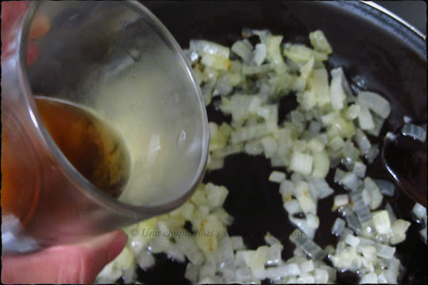 Echar un chorro de vino blanco para cocinar, dejar unos minutos para que evapore el alcohol.