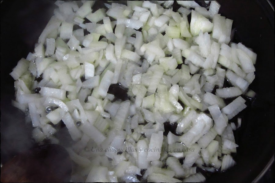 Cortar la cebolla en brunoise, echarle un poco de sal y saltearla en un chorrito de aceite de oliva hasta que empiece a transparentar.