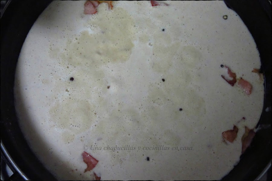 Cuando esté doradito echar la mezcla de la batidora y añadirle unos granos de pimienta.