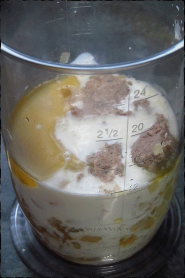 Mezclar con la batidora en un vaso batidor, la nata (crema de leche), la cebolla salteada y el paté.