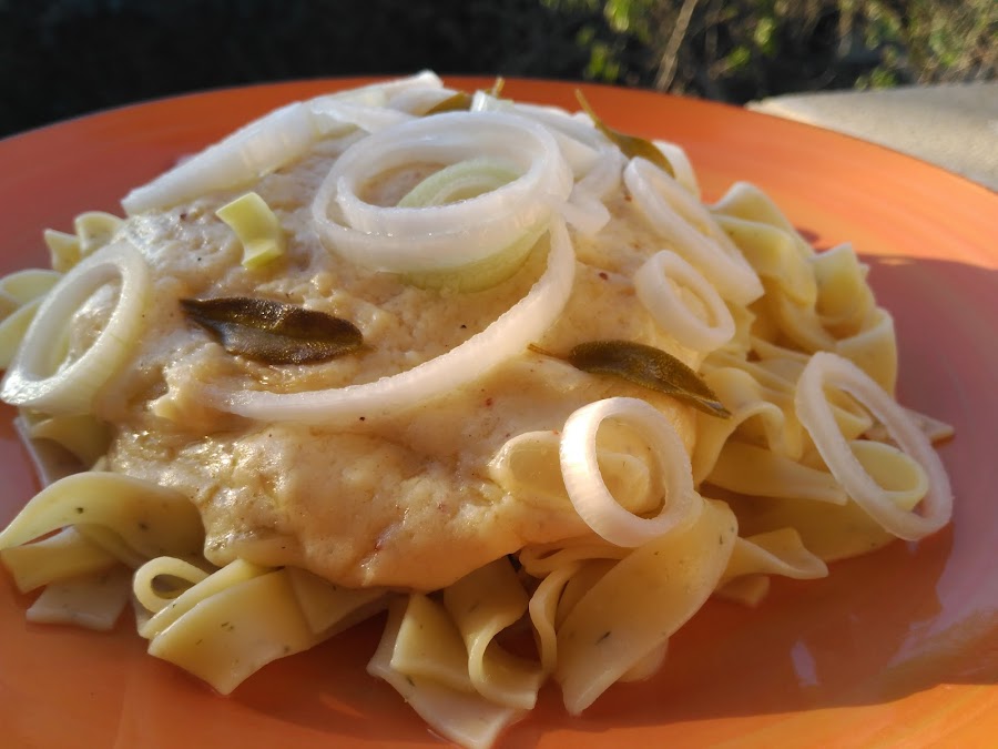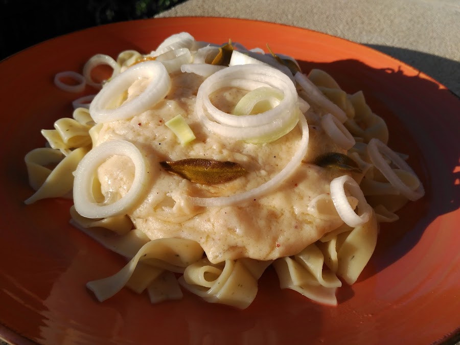 - Mezclamos la salsa con la pasta, la cebolleta y las hojas de salvia...y a la mesa!!
