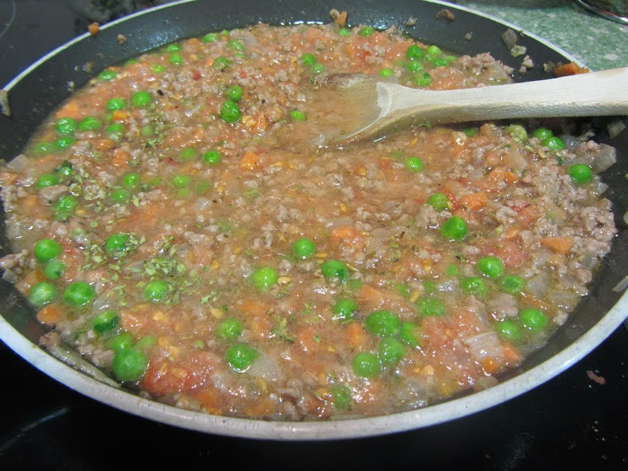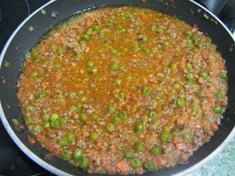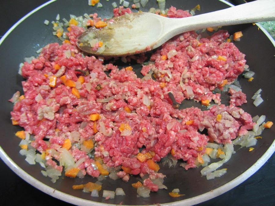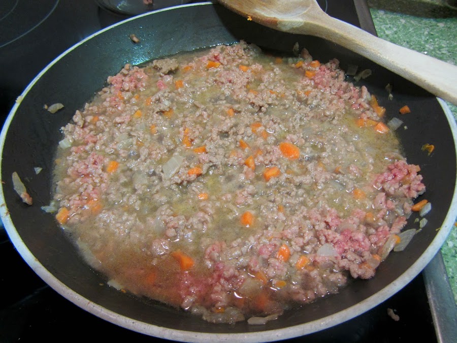 Añadimos la carne picada, y la rehogamos moviéndola con un tenedor o cuchara de palo, y agregando un poquito de caldo o agua, que ayudarán a que no se nos apelotone (tiene tendencia a convertirse en "hamburguesa gigante" a nada que nos descuidemos).