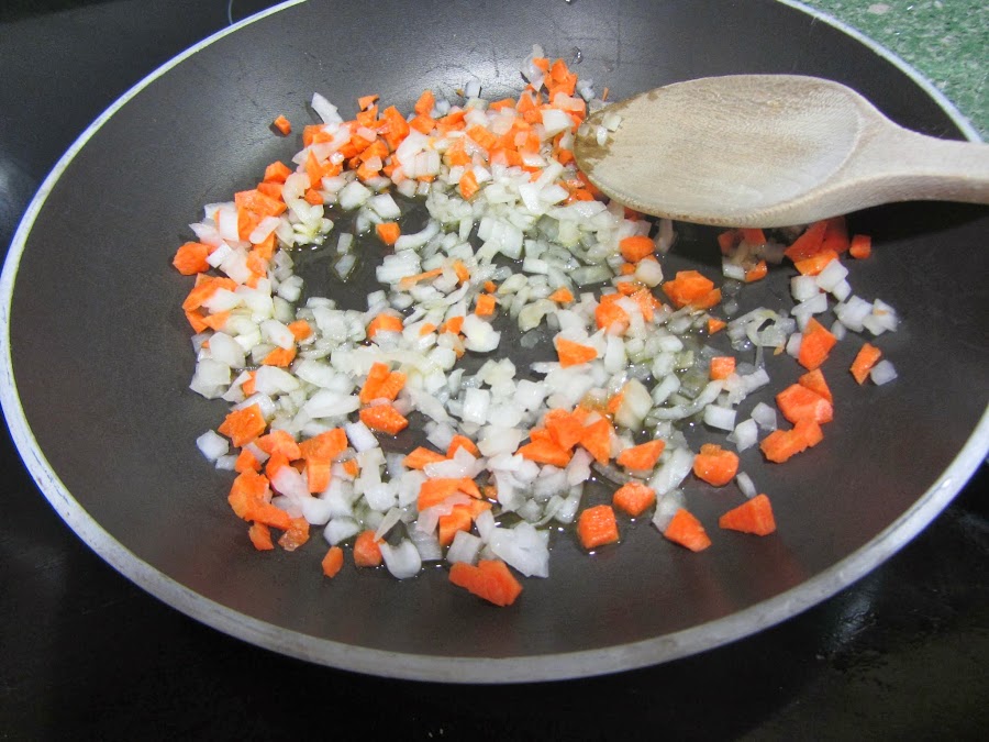 Picamos la cebolla y la zanahoria en juliana finita. Calentamos un chorreón de aceite de oliva en una sartén honda, y rehogamos a fuego medio unos 10 minutos.