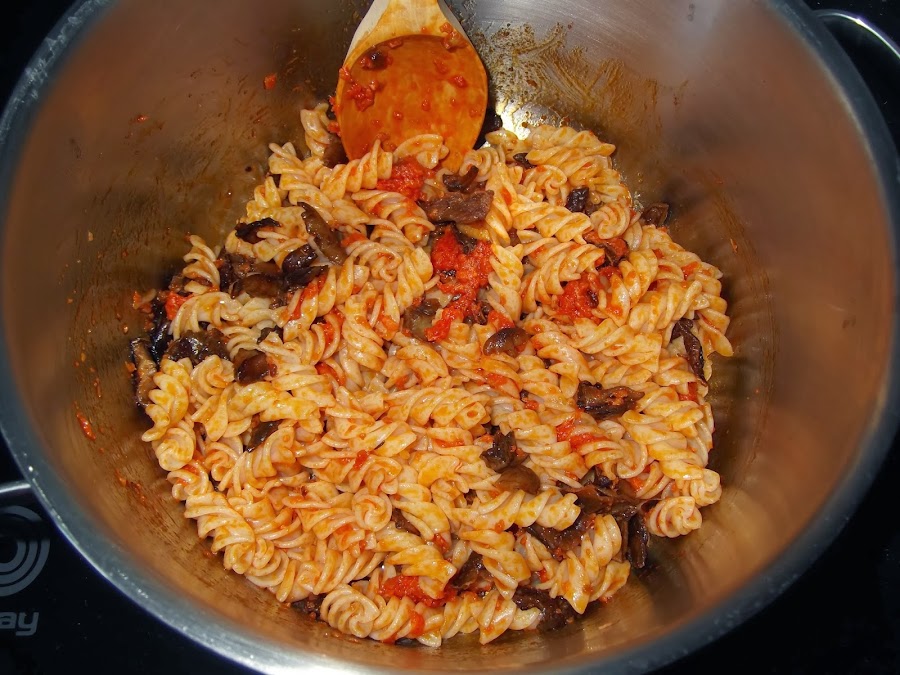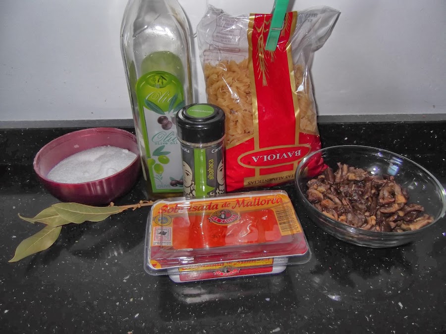 Una vez que se ha cocido la pasta, la echamos en un escurridor y la pasamos por debajo del grifo para que no se quede apelmazada. En la misma olla, echamos las setas cocinadas y la sobrasada cortada en varios trozos, cuando se haya fundido un poco, se le añade la pasta y se le da varias vueltas con una cuchara de madera para que las espirales se impregnen de todos los sabores. Yo he decidido no dejar que la sobrasada se fundiera del todo para que supiera más a este producto, pero eso va por gustos.