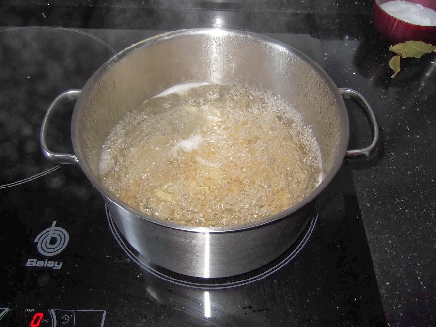 Primero ponemos una olla con abundante agua a calentar, cuando rompa a hervir añadimos la sal, un chorrito de aceite y un par de hojas de laurel. Mira el paquete que te dirá el tiempo que tiene que estar cociendo la pasta.