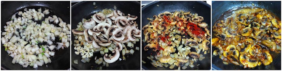 En esa misma sartén, agregamos un poco mas de aceite y pochamos la cebolla picadita. Cuando coja color agregamos el champiñón limpio y laminado y el diente de ajo picado. Cuando se doren agregamos el pimentón, mezclamos bien y añadimos el vodka.
