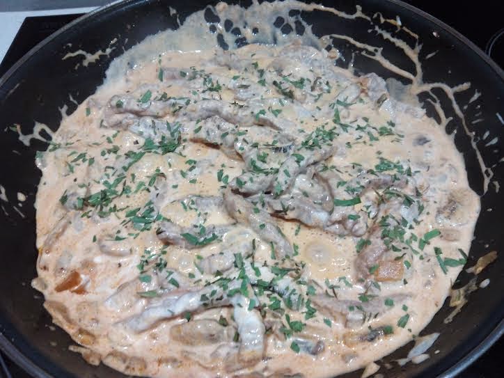Tan solo queda escurrir la pasta, servirla a una fuente con la ternera stroganoff y a disfrutar!