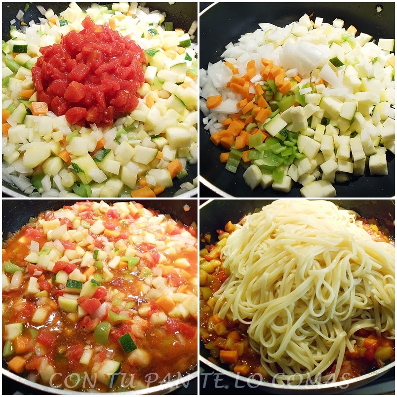 Cortamos todas las verduras en daditos pequeños. En una cazuela o sartén antiadherente lo suficientemente honda para que luego quepa la pasta, ponemos el aceite y pochamos las verduras con sal a fuego medio-bajo. La manera de cocinar con muy poco aceite es esa, porque si lo ponemos a fuego alto las verduras se van a quemar enseguida y no van a soltar el agua que necesitamos. Así que paciencia, que se tienen que hacer lentamente.