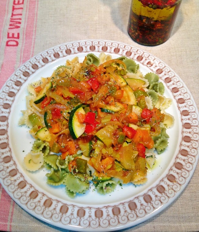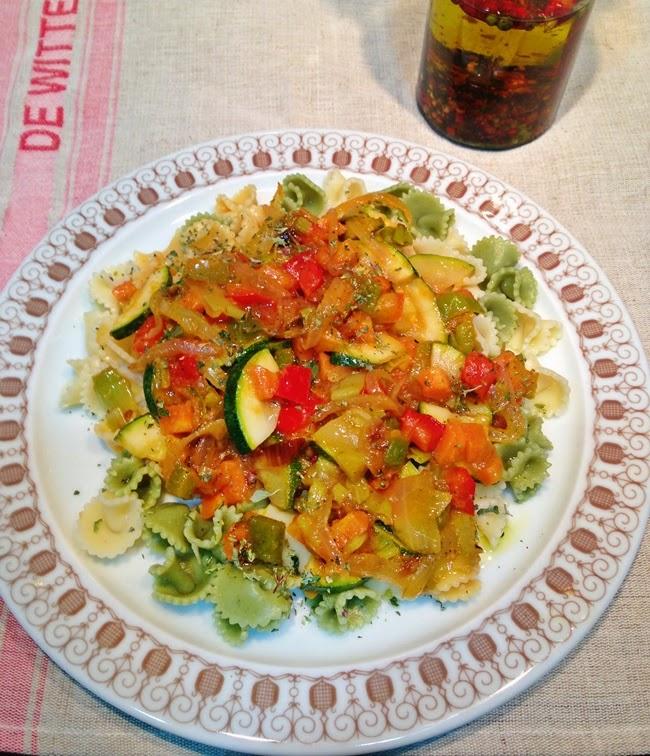 Repartimos las verduras salteadas anteriormente sobre la pasta y lo mezclamos. Podemos espolvorear con un poco de orégano y listo para comer