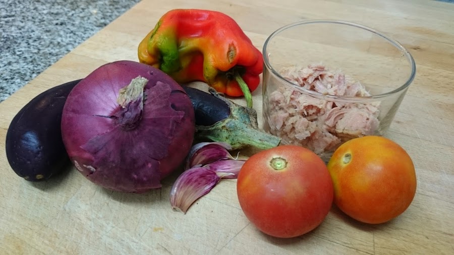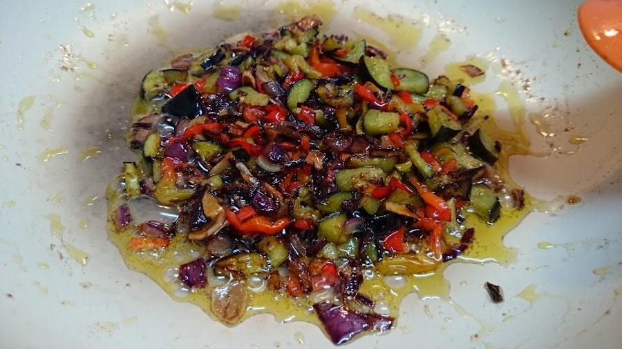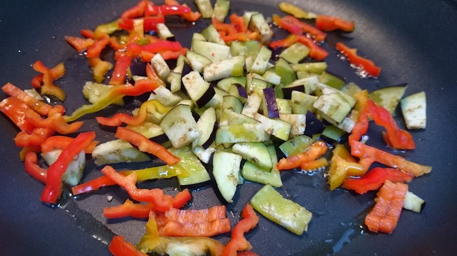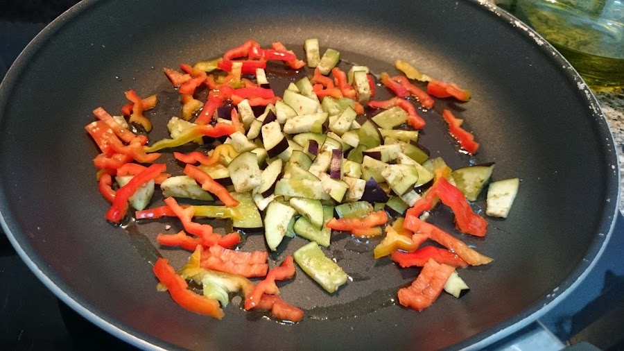 Luego la cebolla, el pimiento y la berenjena.
