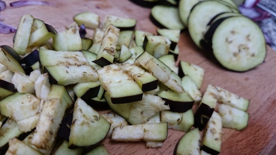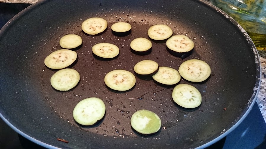 Yo deje unos trozos de berenjena cortados en redondo para decorar.
