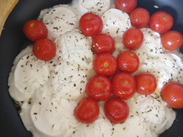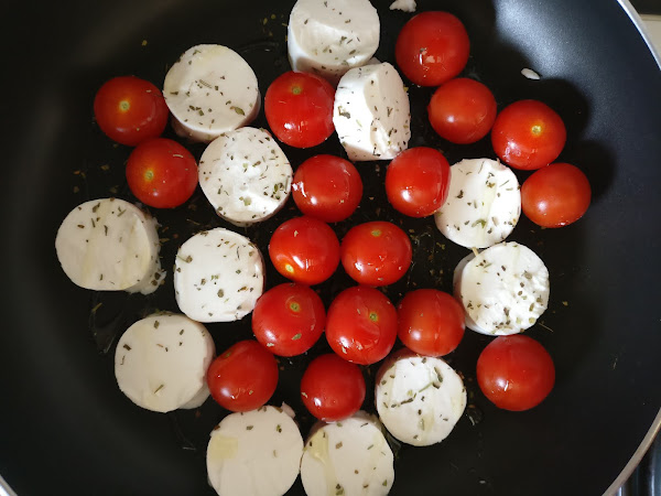 En una sartén antiadherente añadimos los tomatitos lavados y sin rabito junto con el queso de cabra, un chorrito de aceite y las hierbas provenzales. Dejamos a fuego bajo y tapado unos 10 minutos.