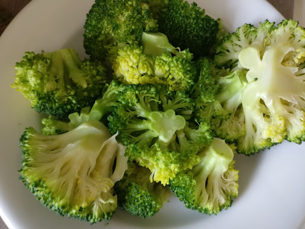 Empezaremos cocinando el brócoli al vapor en el microondas. Para ello separaremos los arbolitos y los colocaremos en un plato o recipiente apto para microondas y le pondremos la tapa del mismo. Cocinaremos 5:30 minutos a 700W.
