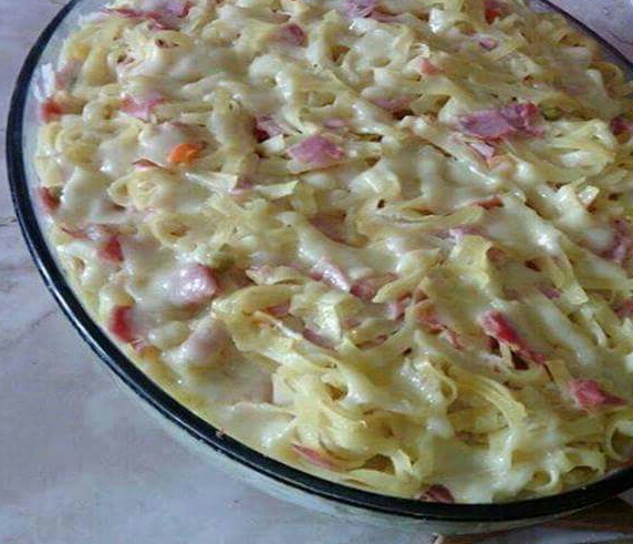 Cocinar la pasta en agua hirviendo con sal y dos dientes de ajo al estar al dente escurrir,para preparada la salsa en una sartén grande colocar la mantequilla y cebolla picada fina mezclar luego agregar el chile dulce picado y apio picado cocinar hasta cristalizar,ya listo colocamos el jamón picado revolver dejar dorar disuelva la crema deshidratada de hongos en la leche agregar al sofrito mezclar coloque la crema dulce dejar hervir,agregamos el queso parmesano,sal y pimienta mezclar colocar la pasta cocinada dejar de nuevo hervir y servir de inmediato.