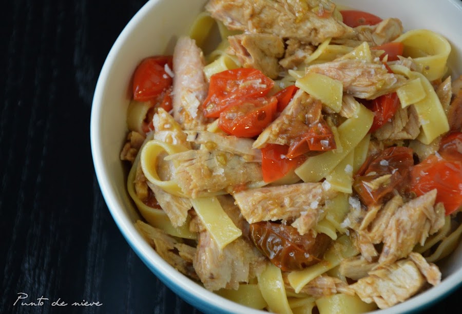 Poco antes de tener la pasta cocida, añadimos el atún a la sartén con los tomates. Cuando la pasta esté lista la pasamos por la sarten con los tomates y el atún y emplatamos.