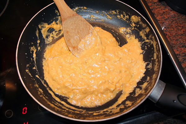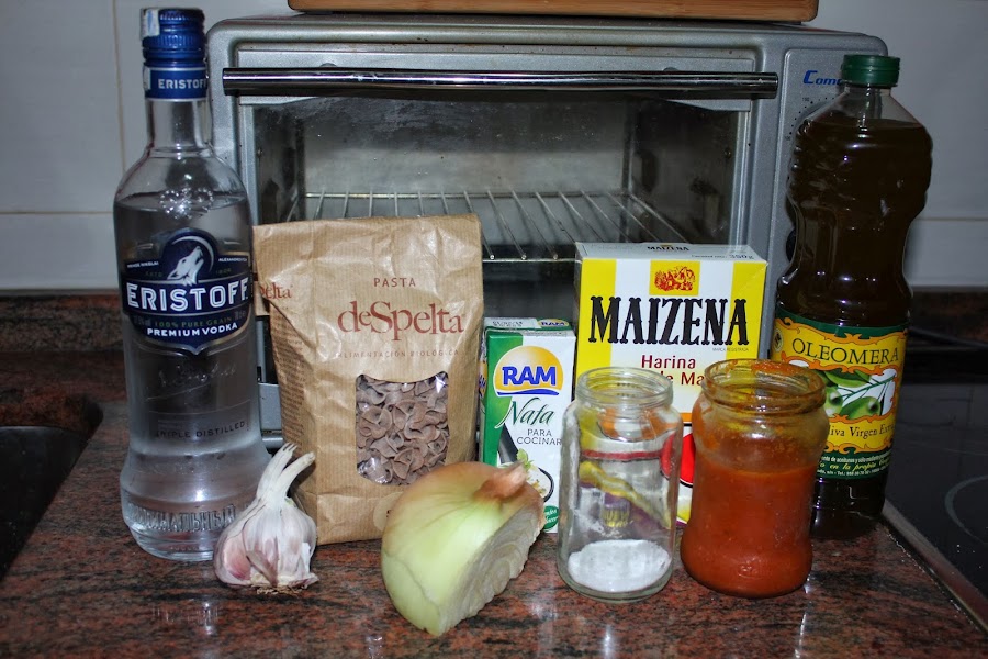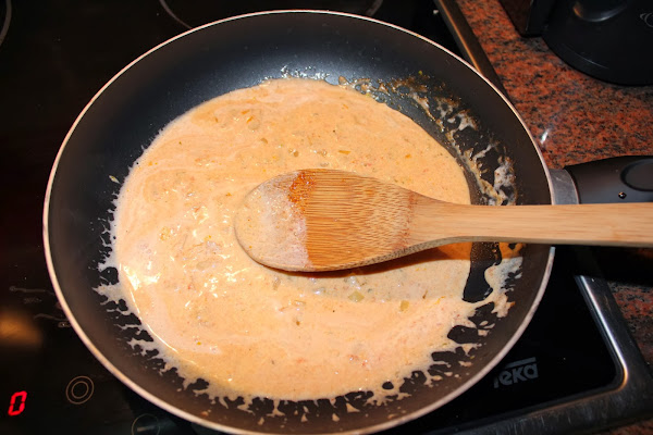 El siguiente paso es añadir a la salsa la nata (crema de leche) y el vodka, tened cuidado con la bebida, ya que si os pasáis le puede dar demasiado sabor al plato. Si os gusta la textura que tiene la salsa la podéis dejar así, pero si queréis que os quede un poco más espesa, disolvéis una cucharadita de maicena en un poco de agua y se la añadís a la salsa.
