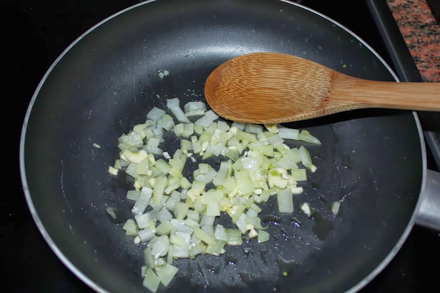 Ahora vamos a comenzar a cocinar la salsa, echamos un poquito de aceite en una sartén y ponemos a pochar la cebolla que habremos cortado en pequeños trozos, luego añadimos el ajo y cuando todo haya cogido un color dorado, le añadimos el tomate frito. Le damos un par de vueltas para que se integren todos los ingredientes y salamos.