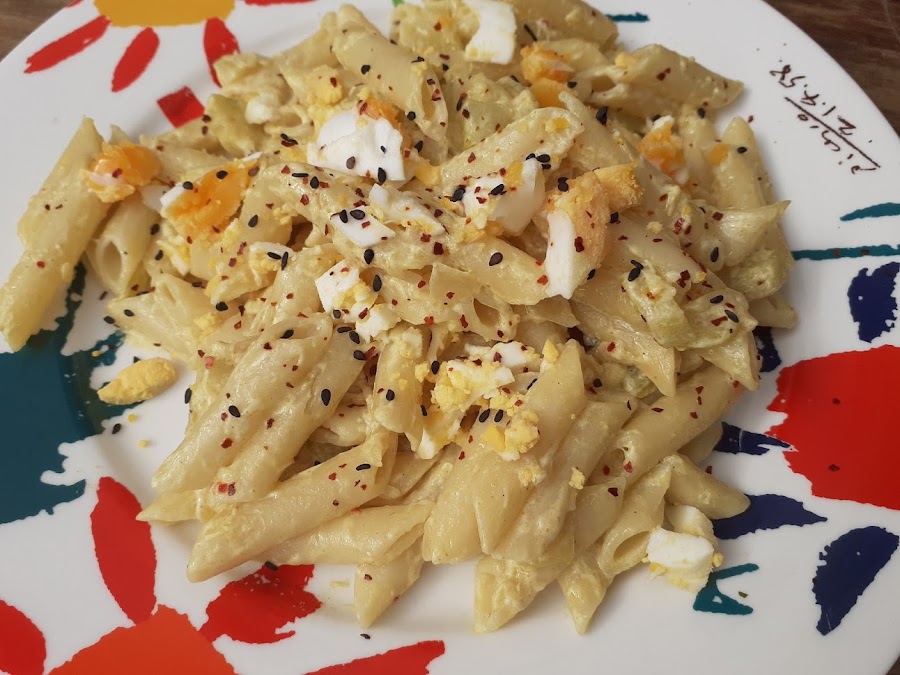 Dejamos que se cocine el calabacín e incorporamos las especias, la sal y la nata (crema de leche). Mezclamos, cocinamos unos minutos y mezclamos con la pasta cocida.