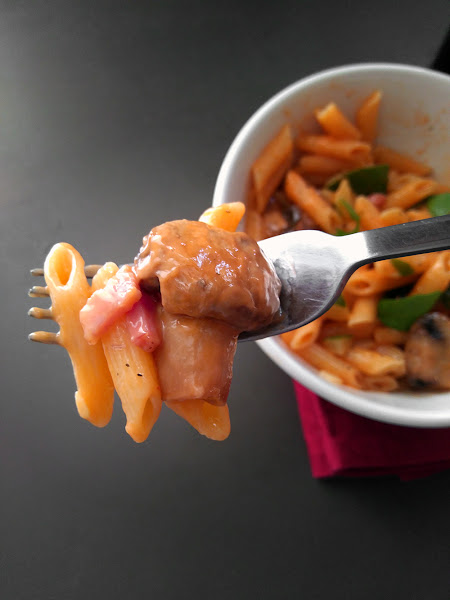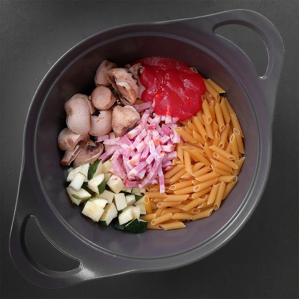 En el estilo One pot, se introducen prácticamente todos los ingredientes al mismo tiempo con el consiguiente ahorro de tiempo, además de hacer la receta apta para el más principiante de los cocineros. El truco, según he ido probando es que los ingredientes de "la salsa" ocupen más o menos la mitad de la olla, mientras que la pasta sea la otra mitad. Nosotros os proponemos una receta con verduras y algo de bacon, pero os recomiendo que probéis con otros muchos ya que admite todos los que queráis.
