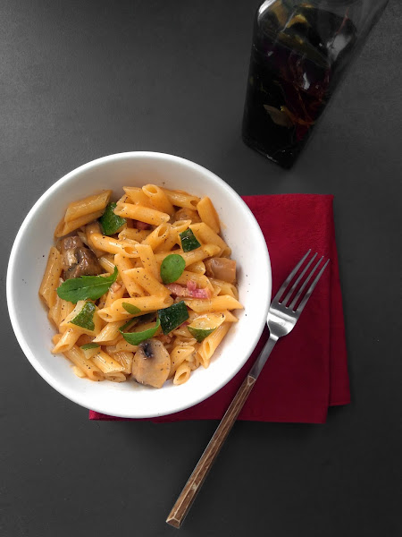 En una olla ponemos la pasta, el calabacín, los champiñones, el bacon, el orégano y la salsa de tomate. Añadimos entonces el caldo y el agua (lo justo para que sólo queden cubiertos los ingredientes) y ponemos a fuego alto. Cuando ya esté casi consumido el caldo, añadimos la nata (crema de leche) y dejamos cinco minutos más a fuego medio.