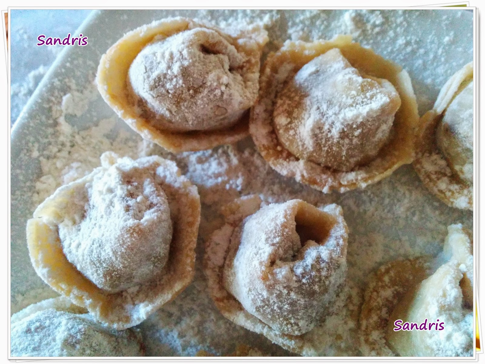 No sé si sabéis bien cómo se forma esta clase de pasta. Esta vez no lo pensé, pero la próxima vez que los haga, haré el paso a paso del formado y así lo veis. Habrán muchos vídeos por internet, supongo, pero bueno, ya que os enseño esta forma de hacer pasta, pues porqué no que sea el formado al completo!!! Queda pendiente!!! :-) Así que nada, rellenamos cada círculo de pasta fresca, lo doblamos como si fuera una media luna y lo que tenemos que hacer ahora es juntar las puntas. Hay que mojarlas y apretarlas ligeramente para que se peguen, sino al cocerse se despegarían y se desharía la forma que le habíamos dado. Al juntar las puntas, se hace el volantito ese típico de los tortellini, se tiene que quedar levantado, si no se queda él solo, le podemos ayudar nosotros mismos y levantarlo un poco para que coja la forma.