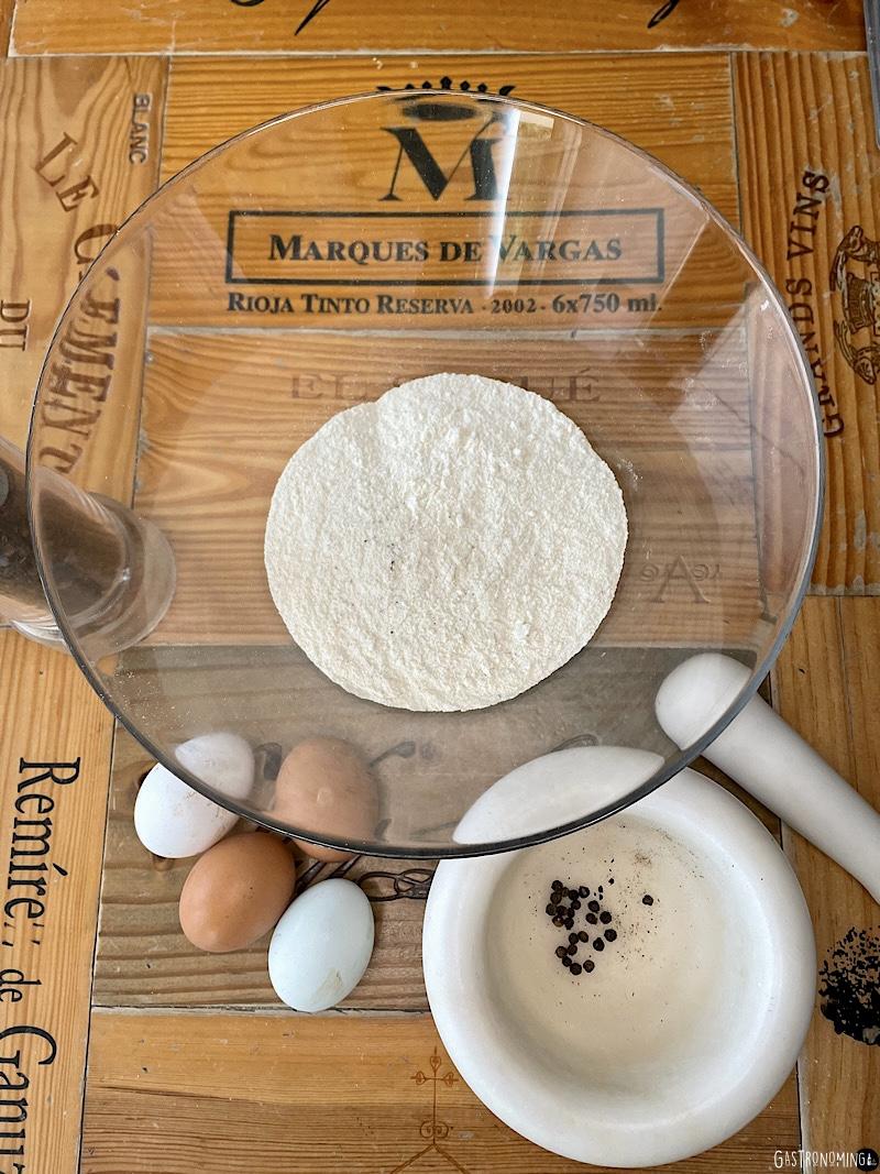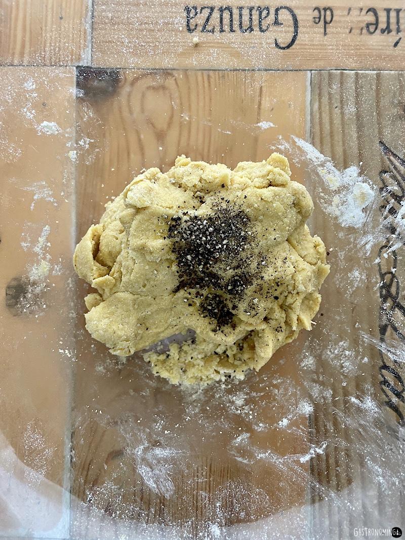 A diferencia de la harina común, esta es algo más gruesa de textura y poca diferencia más, con esto quiero decir que puedes usar otros tipos de harina para hacer esta receta, así que sepas que puedes usar la harina que acostumbras o una harina de trigo de uso común. Esta pasta como todas, puedas hacerla del sabor que quieras, en esta oportunidad la hacemos con un toque de pimienta negra que tanto nos gusta, puedes obviarla si la quieres “al natural” para otro tipo de receta.