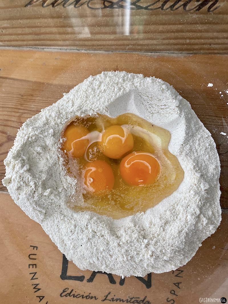 1. Hacer un volcán con la harina en un bol grande, así evitarás manchar más de la cuenta.2. Verter los huevos en el centro del volcán e ir removiendo con los dedos, agregando la harina de alrededor poco a poco hasta mezclar todo.