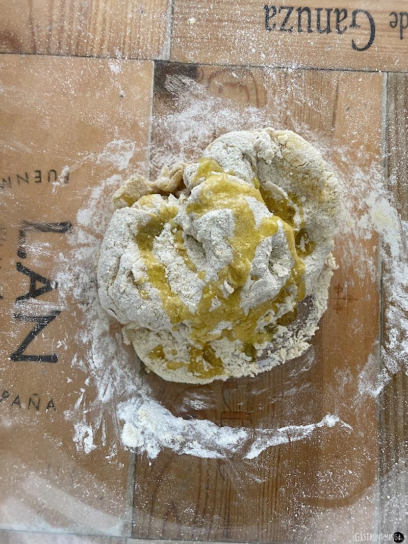 5. Sobre una superficie enharinada empieza a amasarla, espolvoreando harina a medida que extendemos.