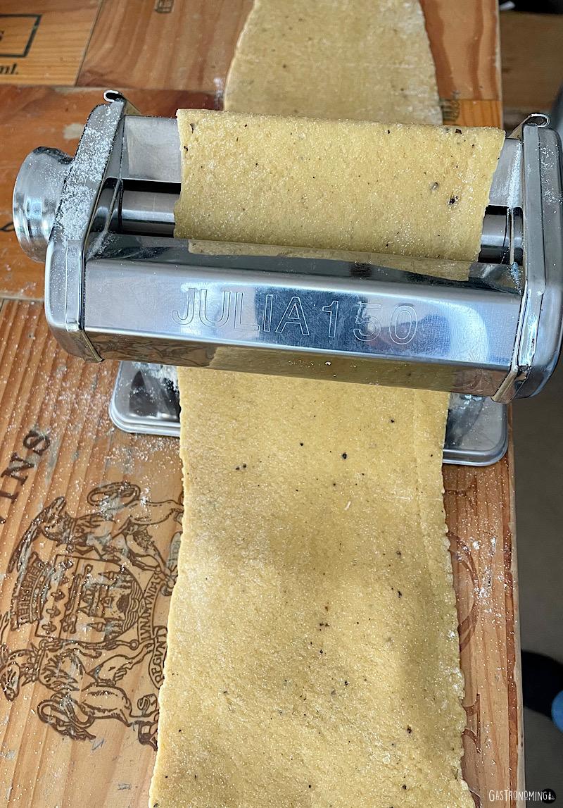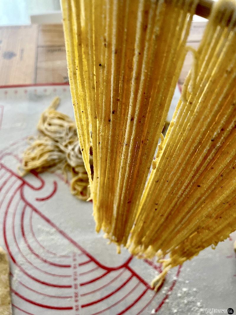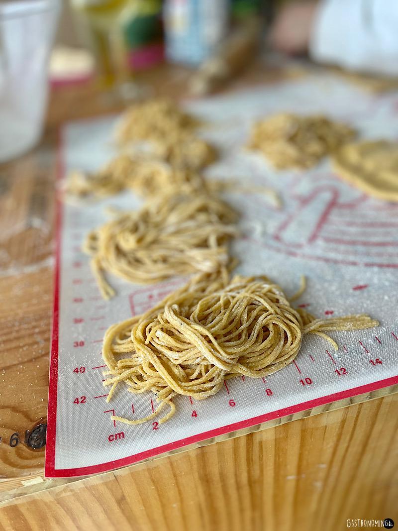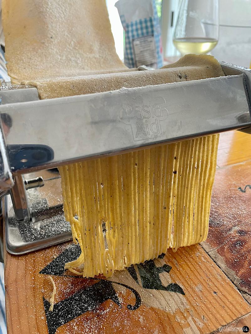7. Pasamos por la cortadora, por el corte de grosor deseado, en este caso tagliolini y dejamos secar al menos media hora colgando la pasta o haciendo nidos y espolvoreando un poco de harina por encima.
