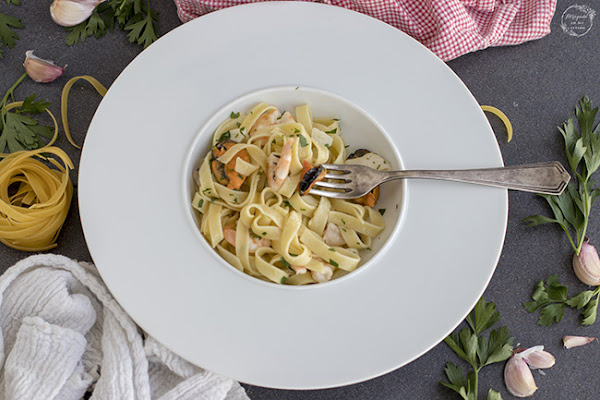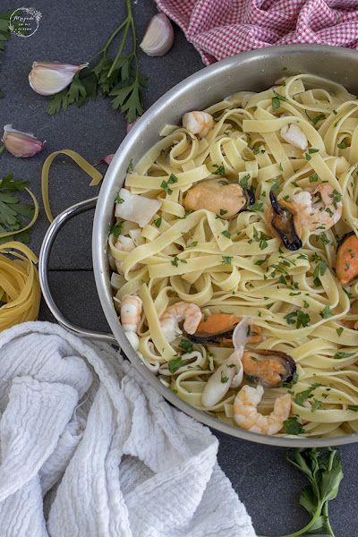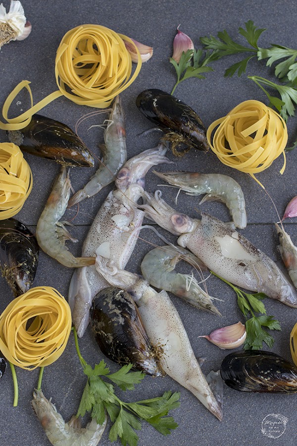 Esta semana los hemos preparado con frutos de mar, langostinos, mejillones y calamares, "futti di mare" como se dice en italiano. Es una pasta muy sana que no lleva ninguna salsa pesada, sino que se liga con el mismo agua de cocer los mejillones.
