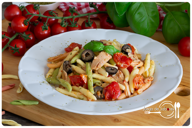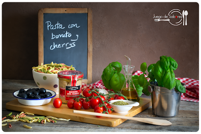 Cuando los tomates estén hechos añadir el bonito y las aceitunas negras cortadas en rodajas. Mezclar bien para que se integren los sabores.