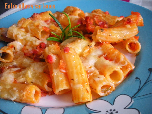 Una vez cocida la escurrimos y la mezclamos con la salsa pasándola a una fuente de hornear y cubriéndola de queso para gratinar. Metemos en el horno hasta que se dore el queso.