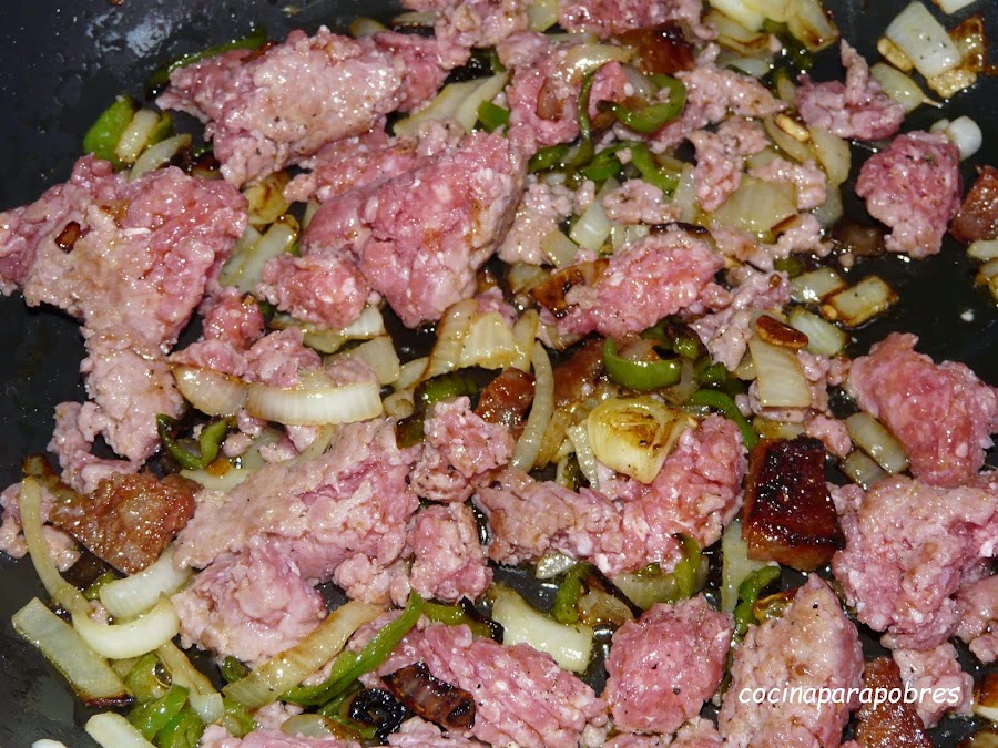En una sartén con aceite ponemos pelados y picados los dientes de ajo, la cebolla y el pimiento verde. Una vez la verdura este bien hecha incorporamos la carne picada .